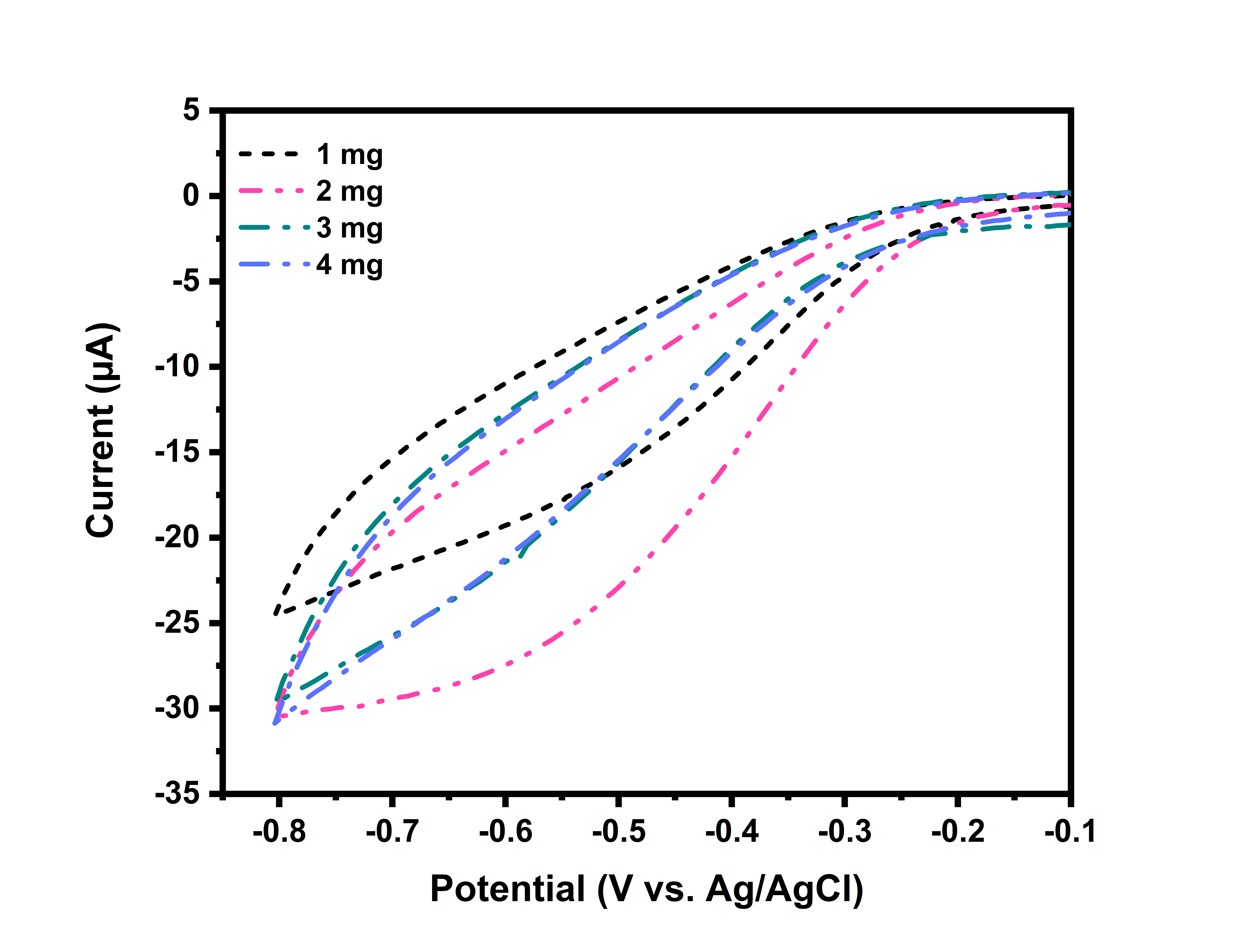 Figure 3 Cyclic voltammograms of 1 mM H2O2 in PBS (pH 7.4) recorded at 100 mV/s with Pt/Pd-MnO2/CNT catalyst loadings of 1, 2, 3 and 4 mg.