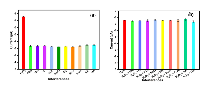Figure 5 Current responding of (a) interferences study of a sensor developed for measuring 1 mM H2O2, and its performance with interference concentrations of (b) 1 mM H2O2 mixed 1 mM interferences at Pt/Pd-MnO2/CNT/SPE at −0.6 V.