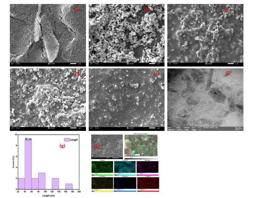 Figure 1 Morphology analysis by SEM (a) bare SPE, (b) MnO2/CNT, (c) Pd-MnO2/CNT, (d) Pt- MnO2/CNT, (e) Pt/Pd-MnO2/CNT, (f) TEM analysis of Pt/Pd-MnO2/CNT, particle size analysis (g) and (h) EDS-SEM mapping of Pt/Pd-MnO2/CNT.