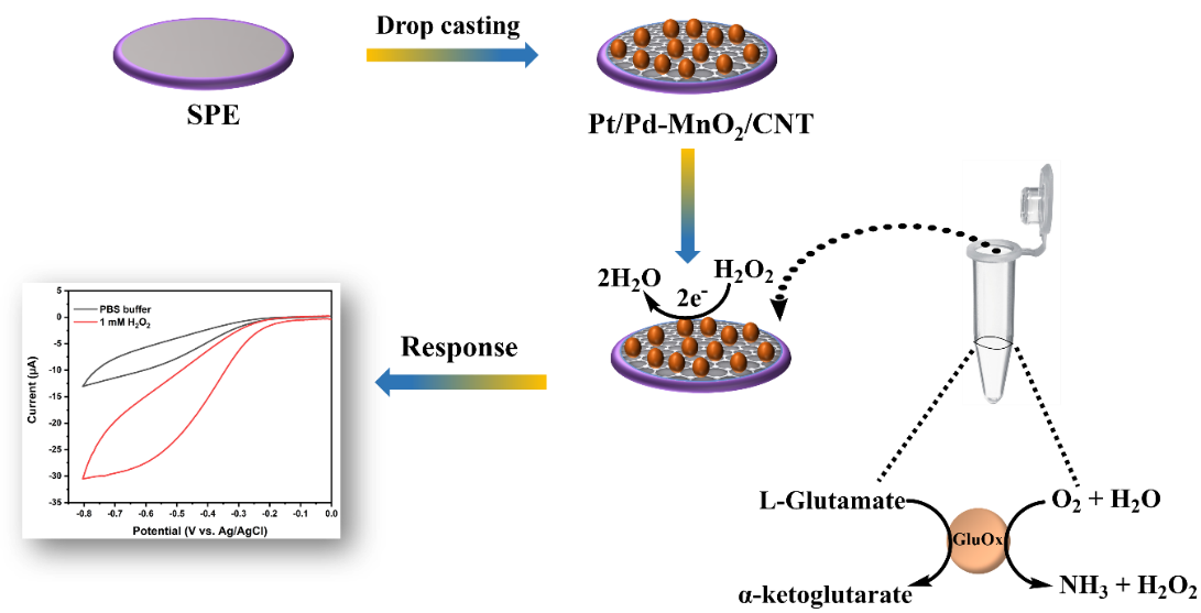 Various analytical techniques have been reported for glutamate quantification, including chromatographic [11-13], spectrophotometric [14,15], capillary electrophoresis [16], and fluorescent-based methods [17]. However, these techniques often present significant drawbacks, such as large volumes of toxic solvents, rendering them non-ecofriendly, high costs and time-consuming procedures due to complex sample preparation and instrument operation. Electrochemical sensors offer a promising alternative, addressing these limitations with advantages such as simplicity, high sensitivity, reliability, portability, rapid response, and cost-effectiveness [18,19]. Electrochemically active materials play a crucial role in enhancing the performance of electrochemical techniques. Manganese dioxide (MnO2), a transition metal oxide, exhibits significant electrocatalytic activity, chemical stability, affordability, and non-toxicity, making it highly efficient for detecting various analytes, including H2O2 [20]. However, its low electrical conductivity presents a limitation. To address this, MnO2 is often combined with highly conductive carbon-based materials such as carbon nanotubes (CNTs) and graphene oxide (GO) to create advanced sensing materials with improved performance [21,22]. In addition to these materials, noble metal nanomaterials such as palladium (Pd) and platinum (Pt) have been widely utilized in electrochemical sensing due to their large surface area, high conductivity, and superior catalytic activity [23-25]. Among them, Pt stands out for its exceptional electrical conductivity and electrocatalytic properties, making it a highly attractive material for sensor development. However, its high cost, driven by limited natural abundance, has motivated extensive research to minimize Pt usage while maintaining its electrocatalytic efficiency [26]. One effective strategy involves alloying Pt with more cost-effective transition metals such as Pd [27], Cu [28] and Ni [29]which exhibits intense catalytic activity. Pt-M bimetallic catalysts offer reduced costs and enhanced catalytic activity and stability compared to monometallic Pt/C catalysts, owing to the synergistic interactions between the constituent metals. Notably, Pt-based alloy catalysts - especially those incorporating Pd - have garnered significant research interest due to their superior performance [30,31]. Additionally, the incorporation of metal oxides such as CeO2 [32], CoO [33], and MnO2 [34] , as well as deposition onto support materials like CNTs, further enhances electrocatalytic performance while reducing overall Pt consumption.