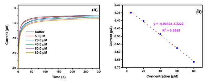 Figure 6 Chronoampergrams of glutamate assay (a), and calibration plot (b) of glutamate at various concentrations from 5 to 80 µM by incubating with 0.2 U/mL glutamate oxidase at Pt/Pd-MnO2/CNT/SPE at −0.6 V.