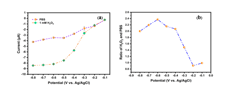 The applied potential influences the sensitivity of Pt/Pd-MnO2/CNT. Current measurements were conducted at various applied potentials to investigate how different potentials affect the current signal of H2O2. As shown in Figure 4(a), the current resulting from the electrocatalytic reduction of H2O2 gradually increases as the applied potential is raised from −0.1 to −0.6 V. However, beyond this potential, the current remains stable with further increases in applied potential. The most significant ratio of reduction current, as illustrated in Figure 4(b) for 1 mM H2O2 compared to the buffer, is observed at −0.6 V. Therefore, −0.6 V was selected as the optimal applied potential for subsequent studies.