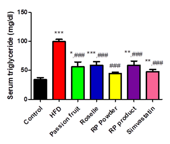 Figure 4 The extracts decreased serum triglyceride levels in HFD-fed rats. Control diet fed rats treated with distilled water (Control, n = 7), HFD-fed rats treated with distilled water (HFD, n = 7), HFD-fed rats treated with passion fruit extract (Passion fruit, n = 5), HFD-fed rats treated with roselle extract (Roselle, n = 5), HFD-fed rats treated with roselle extract and passion fruit extract powder (RP powder, n = 5), HFD-fed rats treated with a product from roselle and passion fruit extract (RP product, n = 6), HFD-fed rats treated with simvastatin (Simvastatin, n = 5). *, **, *** statistically different at p-value < 0.05, 0.01 and 0.001, respectively, when compared to the control group. ### statistically different at p-value < 0.001 when compared to the HFD group.