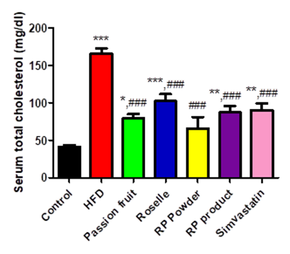 Figure 5 The extracts decreased serum total cholesterol levels in HFD-fed rats. Control diet fed-rats treated with distilled water (Control, n = 7), HFD-fed rats treated with distilled water (HFD, n = 7), HFD-fed rats treated with passion fruit extract (Passion fruit, n = 5), HFD-fed rats treated with roselle extract (Roselle, n = 5), HFD-fed rats treated with roselle extract and passion fruit extract powder (RP powder, n = 5), HFD-fed rats treated with a product from roselle and passion fruit extract (RP product, n = 6), HFD-fed rats treated with simvastatin (Simvastatin, n = 5). *, **, *** statistically different at p-value < 0.05, 0.01, and 0.001, respectively, when compared to the control group. ### statistically different at p-value < 0.001 when compared to the HFD group.
