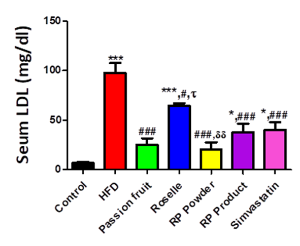 Figure 6 The extracts decreased serum low-density lipoprotein (LDL) levels in HFD-fed rats. Control diet fed-rats treated with distilled water (Control, n = 7), HFD-fed rats treated with distilled water (HFD, n = 7), HFD-fed rats treated with passion fruit extract (Passion fruit, n = 5), HFD-fed rats treated with roselle extract (Roselle, n = 5), HFD-fed rats treated with roselle extract and passion fruit extract powder (RP powder, n = 5), HFD-fed rats treated with a product from roselle and passion fruit extract (RP product, n = 6), HFD-fed rats treated with simvastatin (Simvastatin, n = 5). *, *** statistically different at p-value < 0.05 and 0.001, when compared to the control group. #, ### statistically different at p-value < 0.05 and 0.001 when compared to the HFD group. τ statistically different at p-value < 0.05 when compared to the Passion fruit group. δδ statistically different at p-value < 0.01 when compared to the Roselle group.