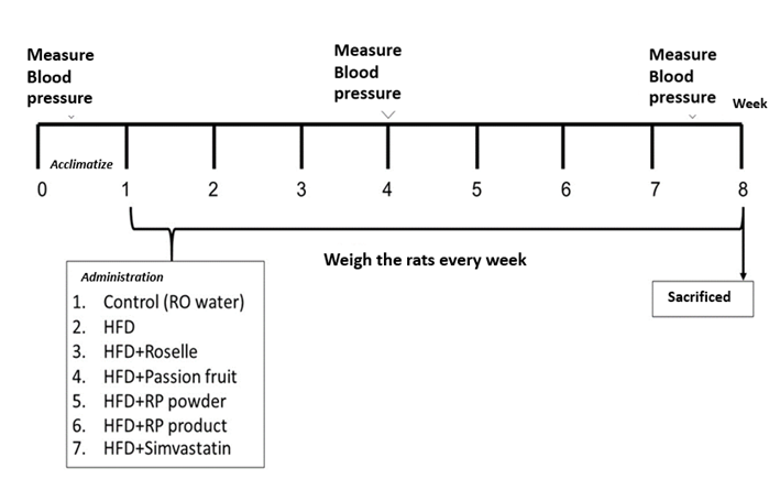 Rats were grouped and housed together, with 2-3 rats per cage, in an accredited animal room maintained at constant humidity (40% - 60%), temperature (22.0 ± 1.0 °C), and a 12/12-h light-dark cycle. They were given a one-week acclimatization period. Following acclimatization, the rats were divided into seven groups as follows: (1) control group (C; n = 7) fed a standard rat diet, (2) HFD group (n = 7), (3) high-fat diet treated with passion fruit juice with pulp concentrate group (Passion fruit; n = 5), where the rats were fed a high-fat diet and orally administered passion fruit juice with pulp concentrate at a dose of 500 mg/kg body weight (BW), (4) high-fat diet treated with roselle calyces extract group (Roselle; n = 5), where the rats were fed a high-fat diet and orally administered roselle calyces extract at a dose of 500 mg/kg BW, (5) high-fat diet treated with a mixture of roselle calyces extract and passion fruit juice with pulp concentrate in powder form group (RP powder; n = 5), where the rats were fed a high-fat diet and orally administered 250 mg/kg BW of roselle calyces extract powder and 250 mg/kg BW of passion fruit juice with pulp concentrate powder, (6) high-fat diet treated with a jelly drink containing polyphenol-rich roselle calyces extract (250 mg/kg BW) and passion fruit juice with pulp concentrate (250 mg/kg BW) group (RP product; n = 6) administered via oral gavage, and (7) high-fat diet treated with simvastatin group (Simvastatin; n = 5) administered via oral gavage at a dose of 40 mg/kg BW. The standard diet provided 10% of energy from fat containing 4.5 g of fat/100 g of pellets, while the HFD provided 36% of the total energy intake containing 20 g of fat/100 g of pellets. The standard diet and HFD are given in ad libitum. The rats’ body weights were measured weekly.