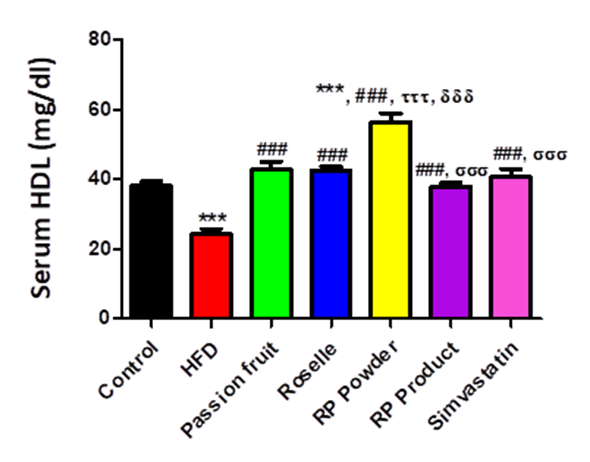The serum HDL levels were evaluated in this study to compare the effect of extracts in various groups in HFD-fed rats. The HFD group exhibited a significant decrease in serum HDL levels compared to the control group (p < 0.001). Interestingly, the passion fruit, roselle, RP powder, RP product, and simvastatin groups showed significant increase in serum HDL levels compared to the HFD group (p < 0.001) (Figure 7). These findings indicate that all the extracts enhance serum HDL levels in HFD-fed rats.