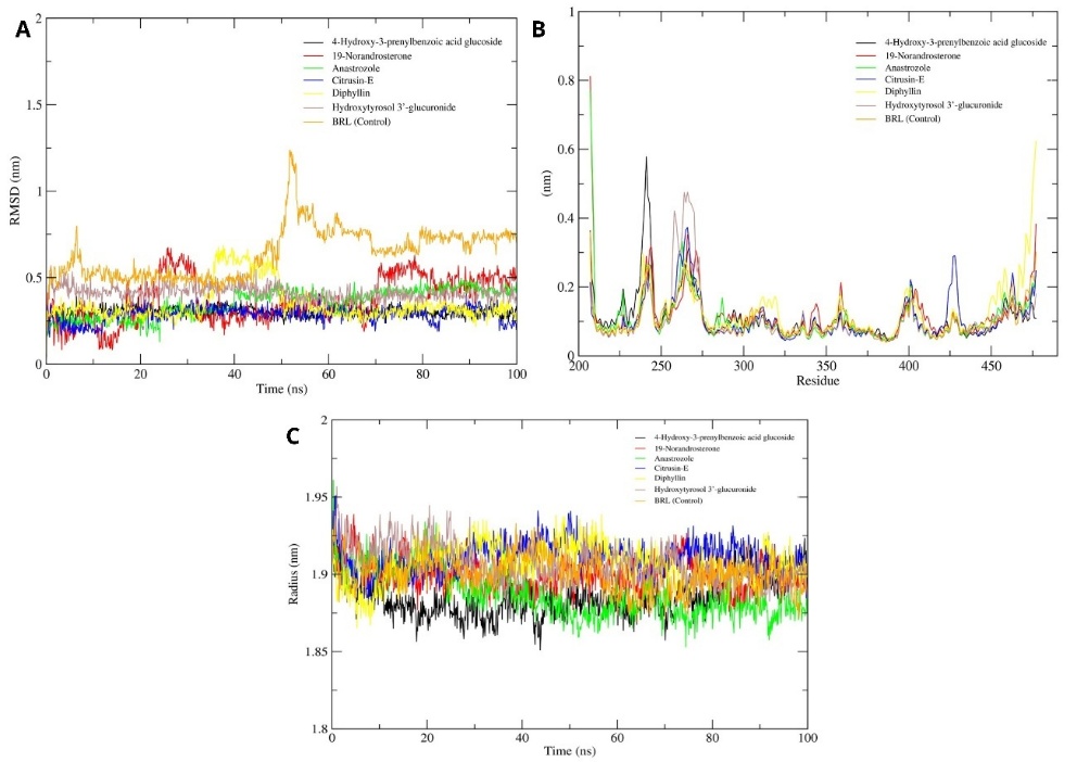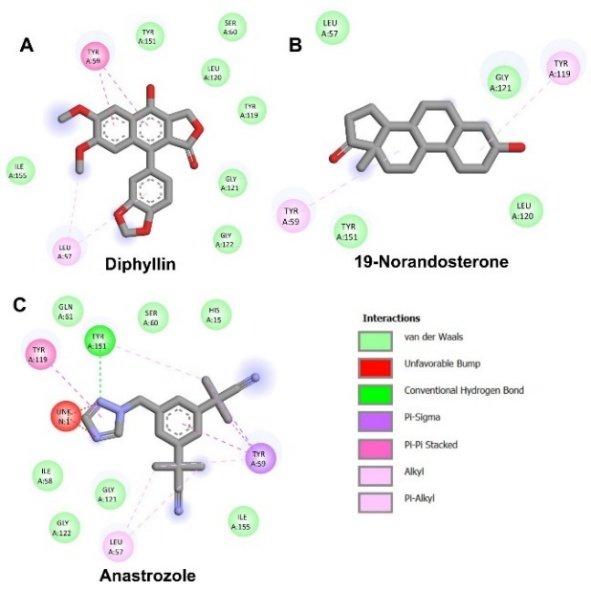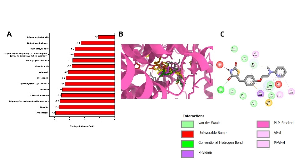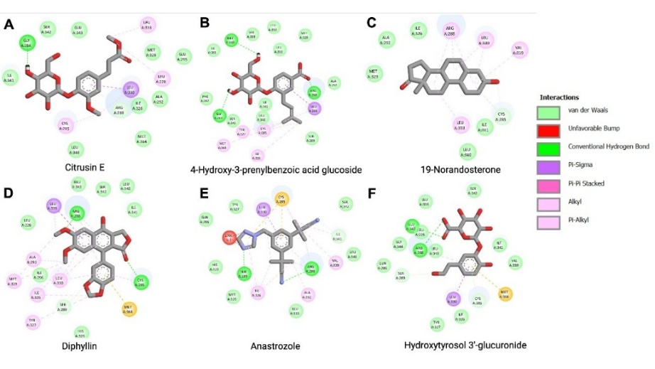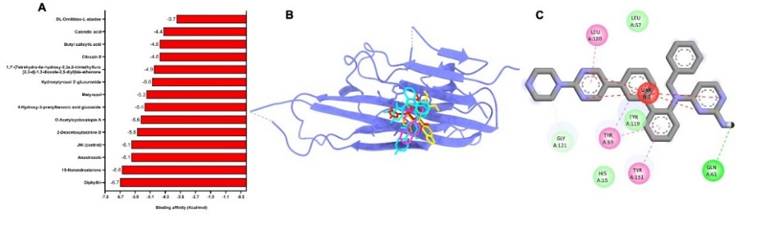 The toxicity screening results (Table 1) revealed that compounds Diphyllin, Anastrozole, 1,1'-(Tetrahydro-6a-hydroxy-2,3a,5-trimethylfuro[2,3-d]-1,3-dioxole-2,5-diyl)bis-ethanone, O-Acetylcyclocalopin A, and Methyl (R)-9-hydroxy-10-undecene-5,7-diynoate glucoside were predicted to be mutagenic based on the Ames test. hERG II inhibition, which contributes to cardiac risk, was predicted for Diphyllin, 4-hydroxysphinganine, and 19-Norandrosterone. Hepatotoxic potential was observed in Anastrozole, Hydroxytyrosol 3'-glucuronide, 4-Hydroxy-3-prenylbenzoic acid glucoside, Citrusin E, and Calendic acid, indicating the need for caution in considering these compounds for systemic use. Additionally, skin sensitization predictions identified 4-hydroxysphinganine, Calendic acid, and 19-Norandrosterone as likely irritants. Interestingly, only 2 compounds - Anastrozole and 19-Norandrosterone - were predicted to be non-toxic in the T. pyriformis toxicity model, suggesting a limited environmental toxicity profile. These findings highlight the importance of ADMET and in silico toxicity screening as a preliminary step in identifying promising bioactive compounds, while simultaneously eliminating those with unfavorable pharmacokinetic or safety characteristics.