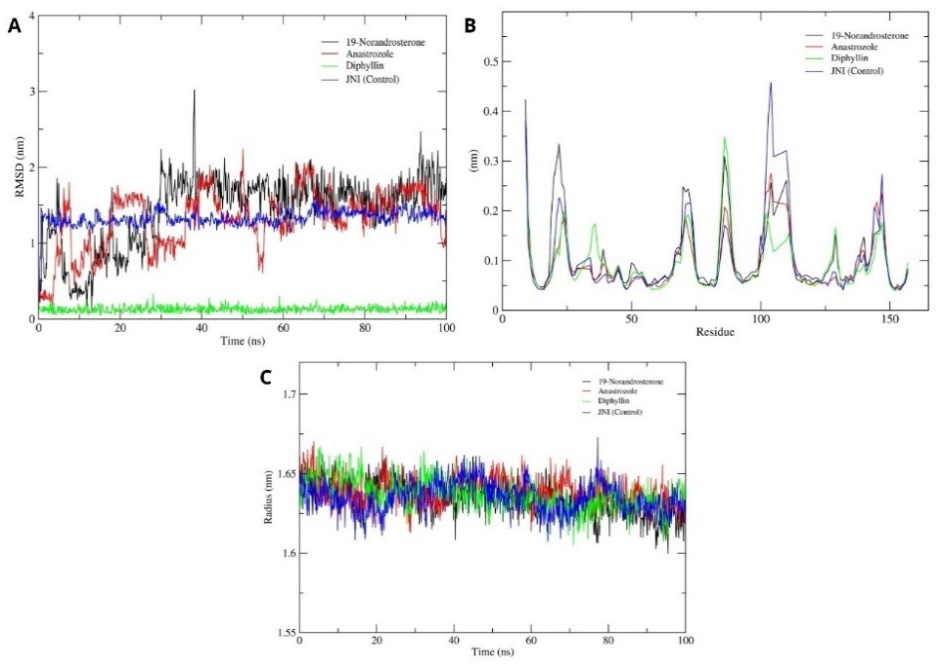 Protein topologies were generated with the AMBER99SB-ILDN force field using pdb2gmx, and ligand topologies were prepared using Acpype to ensures accurate simulation of protein-ligand interactions. The system was neutralized with NaCl at physiological pH and used periodic boundary conditions. Long-range electrostatics were calculated using the Particle-Mesh Ewald (PME) method, with Fast Fourier Transform (FFT) used computational efficiency, and the TIP3P water model was used for solvation. Simulations began with energy minimization, followed by equilibration under NVT (250 ps) and NPT (250 ps) conditions. The main production run was performed for 100 ns under NPT conditions at 310 K using GROMACS 2024.1 [24]. Binding free energies were calculated across simulation frames using UNI-GBSA [25] and gmx-MMPBSA [26].