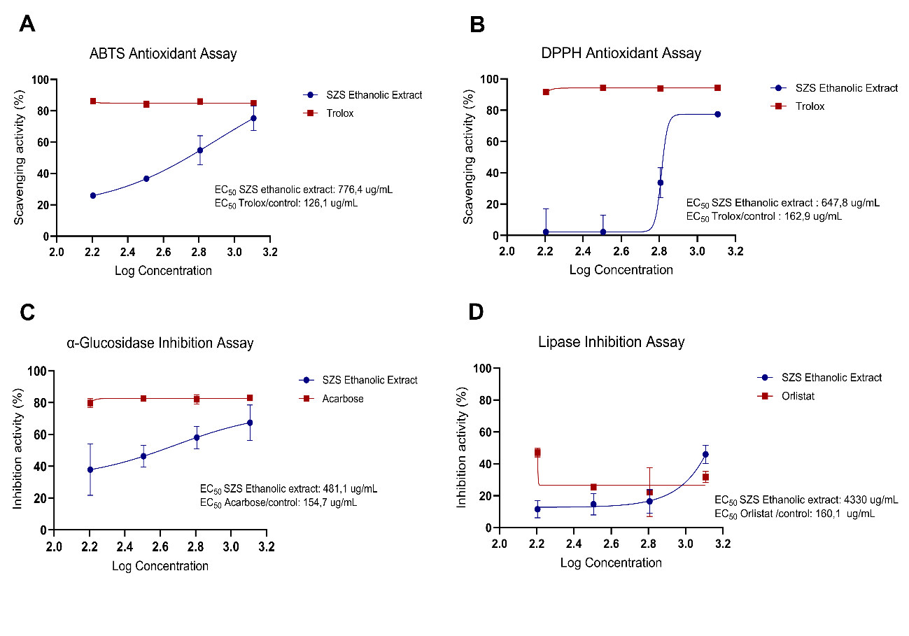 Carbohydrate and lipid metabolism are crucial for maintaining overall metabolic health and preventing metabolic syndrome, which includes conditions such as obesity, high blood pressure, elevated blood sugar, and abnormal lipid levels [67]. Individuals with metabolic syndrome often experience impaired carbohydrate and lipid metabolism, leading to insulin resistance, hyperglycemia, and dyslipidemia [68]. These metabolic abnormalities contribute to the development and progression of metabolic syndrome, which is strongly associated with an increased risk of cardiovascular disease and type 2 diabetes [69]. To evaluate the effect of SZS ethanol extract on carbohydrate and lipid metabolism, α-glucosidase and lipase inhibition assays were performed. These assays are commonly used to measure the activity of these enzymes and provide valuable information about their inhibition, that plays a significant role in carbohydrate and lipid metabolism