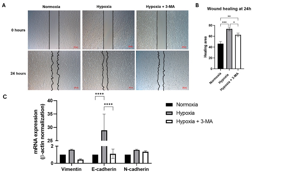 EMT is a crucial process in cancer progression, especially in facilitating metastasis. To assess EMT in VNBRCA1 cells, we conducted both a wound healing assay (to evaluate migratory capacity) and RT-qPCR (to measure the expression of EMT-related genes) under 3 distinct conditions; normoxia, hypoxia (induced by CoCl₂ treatment), and hypoxia supplemented with 3-MA. The result interestingly showed that the hypoxia exhibited the top migration compared to hypoxia+3-MA and normoxia. The hypoxia supplement with 3-MA showed a lower migration rate compared to hypoxia as well, yet still higher than that of normoxia. Specifically, the wound healing ability of normoxia, hypoxia, and hypoxia treated with 3-MA is 46.36% ± 3.3%, 73.37% ± 2.69%, and 62.53% ± 2.74%, respectively. The area of wound healing expanded around 1.5 times in hypoxic conditions (p-value 0.001) compared to the normoxic condition, proving that CoCl2-mediated hypoxia also significantly enhanced cell migration. Furthermore, the wound healing area was reduced in size by approximately 1.17 times (p-value 0.05) after being treated with 3-MA in a hypoxic condition. Additionally, the wound healing area under hypoxia supplemented with 3-MA showed significant differences in healing ability compared to normoxic conditions, approximately 1.3 times greater (p-value < 0.01) (Figures 5(A) - 5(B)). These results highlight the importance of autophagy in promoting cell migration during hypoxic stress, indicating that autophagy may serve as a mediator of EMT (Figure 7).