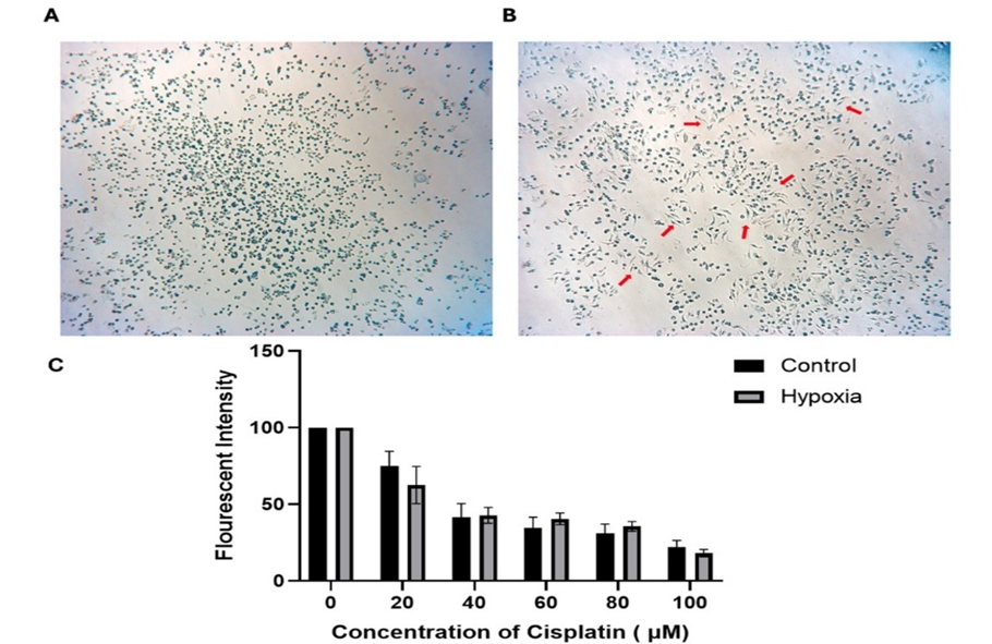 Figure 6 Images of VNBRCA1 demonstrating the effects of 60 μM Cisplatin in traditional (A) and hypoxia models (B). The proliferation of VNBRCA1 under the influence of Cisplatin in both traditional and hypoxia models (C).