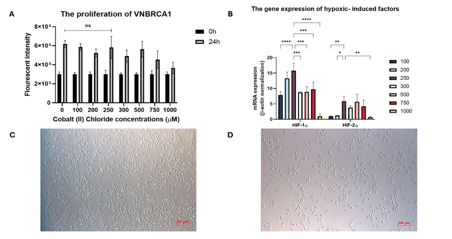 Figure 2 Optimize CoCl2 concentration to induce hypoxia. (A) VNBRCA1 proliferation after 24 h, and (B) expression of hypoxic-related genes HIF-1α and HIF-2α at CoCl2 concentrations from 0 - 1000 μM (*p < 0.05, ** p < 0.01, *** p < 0.001, ****p < 0.0001). The cell morphology was captured under normoxic (C), and hypoxic conditions (D).