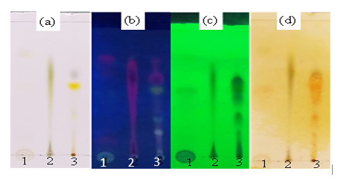 Figure 1 Alkaloid phytochemical test results using a TLC plate. 1). Extract; 2). n-hexane fraction; 3). dichloromethane fraction; (a) Before spraying reagent, b). UV 366, c). UV 254, d). Dragendroff spotting.