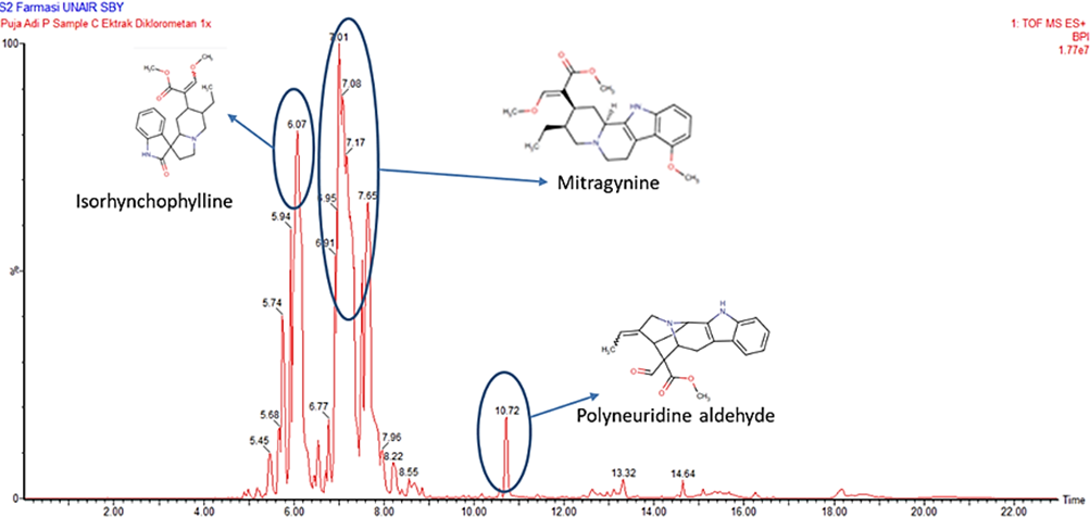Figure 5 displays the results of the chromatogram data obtained. The analysis of principal ions and molecular formulas of compounds was conducted utilizing the MassLynx V4.1 SCN884 application from Waters Inc. The outcomes of compound interpretation are presented in Table 2. Data interpretation showed the presence of 8 alkaloid compounds, including 7-Hydroxymitragynine at RT 6.77, Corynantheidine at RT 6.91, Isorhynchophylline at RT 6.07, Mitragynine at RT 7.08, Pholcodine at RT 8.22, and Polyneuridinealdehyde.