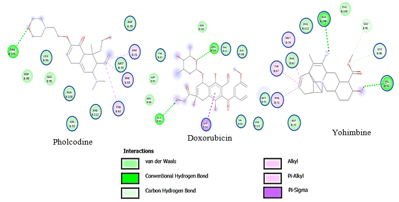 Figure 8 Interaction of Pholcodine and Yohimbine compounds compared with doxorubicin on 2W3L protein. Blue circles on amino acids indicate amino acid residues that are similar to the native ligand.