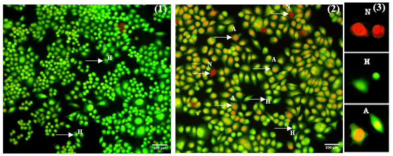 Figure 4 The results of the morphological imaging of T47D cells utilizing AO/EB staining, cells were viewed and counted using a microscope at 100× magnification and scale bar 200 µm. (1) Cells control; (2) The treatment using alkaloid fraction IC50 concentration; (3) Illustration of the differences between populations of cells. ( H) Normal living cells; ( A) apoptotic cells; ( N) necrotic cells.