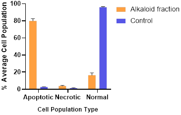 Confluent T47D cell cultures were harvested and counted. The apoptosis assay utilizing the AO/EB double staining method employed 5×104 cells each well, with an amount of 200 μl each well. The cell suspension was uniformly applied to the coverslip and subsequently incubated for a duration of 3 to 30 min to facilitate cell adhesion to the coverslip. Add 800 μL of media to the well gradually and incubate for 36 h in a CO2 incubator. The treatment of T47D cells involved a control treatment and the active alkaloid fraction sample at its IC50 concentration, followed by a 24 h incubation period. The culture media was discarded, and the cells were washed with PBS. The cover slip containing the cells was then placed on a glass object and treated with 10 μL of acridine orange/ethidium bromide (AO/EB) mixture reagent. Cell morphology was observed using a fluorescence microscope [23]. The calculation of cells that experience apoptosis, necrosis, and living cells was carried out in 3 replications with the results of the average percentage of the cell population ± SD. Each replication was calculated at least 200 total cells expressing apoptosis, necrosis and living cells in each sample. The percentage data of apoptosis, necrosis, and live cells from each sample were then statistically tested.