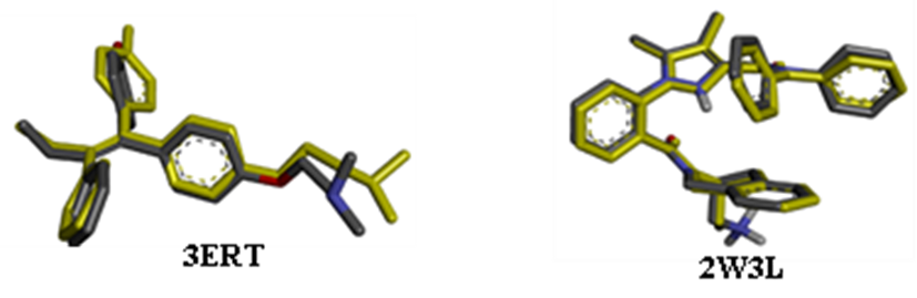 Molecular docking analysis was conducted to investigate the binding mode of compounds within the active site of the ligand-binding domain of human estrogen receptor α in complex with 4-hydroxytamoxifen (PDB: 3ERT) and Bcl2-xL Phenyl Tetrahydroisoquinoline Amide Complex (PDB: 2W3L). The native ligand of 3ERT is 4-hydroxytamoxifen, while the native ligand of 2W3L is 1-(2-{[(3S)-3-(aminomethyl)-3,4-dihydroisoquinolin-2(1H)-yl]carbonyl}phenyl)-4-chloro-5-methyl-N,N-diphenyl-1H-pyrazole-3-carboxamide. The protein structures of 3ERT and 2W3L were generated utilizing AutoDock Tools. All atypical residues and water molecules were eliminated from the foundational structure. Additionally, the system was enhanced by incorporating all absent hydrogen atoms and Kollman charges. The synthesized protein receptors were subsequently exported in pdbqt format and directly positioned into the PyRx workspace directory.
