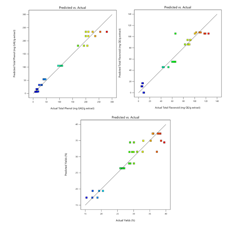 While these optimization results provide useful guidance for process conditions, it is important to acknowledge the potential trade-offs that arise when multiple responses are considered simultaneously. Although the present study applied a single-objective optimization approach for TPC, TFC and extraction yield individually, it is critical to recognize that these responses are not always complementary. In particular, higher extraction yields achieved through elevated voltage or prolonged extraction time may lead to thermal degradation of phenolic and flavonoid compounds, as observed in the declining TPC and TFC values at 270 s in certain conditions. These observations underscore the inherent trade-offs between maximizing extract quantity and preserving compound stability and bioactivity. Therefore, the optimal extraction condition proposed in this study should be interpreted as a practical compromise balancing efficiency and molecular integrity rather than achieving absolute maxima for each variable. While a full multi-objective optimization (e.g., Pareto front) was beyond the scope of this work, it represents an important direction for future research to more systematically account for competing objectives in extraction system design. Although the process was successfully optimized using an empirical RSM approach, the current dataset did not permit reliable kinetic or thermodynamic modeling. Further studies are recommended to develop mechanistic models by incorporating more frequent time-point sampling and advanced thermal characterization.