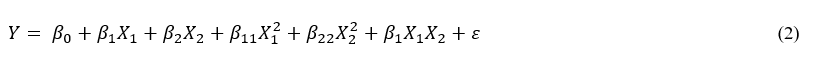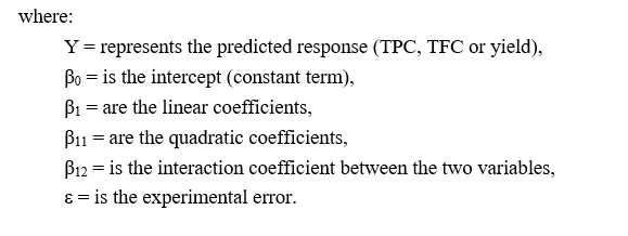 The experimental data were fitted to a second-order (quadratic) polynomial regression model to describe the relationship between the independent variables and the responses. The model equation used was as follows:
