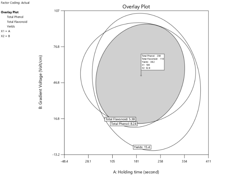 These results confirm that holding time and gradient voltage are critical parameters in optimizing the extraction efficiency and bioactive compound recovery from ant nest. The identified optimal conditions enhance extraction yield while preserving the integrity of phenolic and flavonoid compounds. The overlay plot (Figure 6) clearly indicates an optimal region where the combined effects of holding time and gradient voltage maximize yield, TPC and TFC. The synergistic interaction between temperature (from internal heating) and the applied electric field enhances mass transfer, cell wall disruption and selective release of bioactive compounds. Conversely, excessively prolonged holding times and high gradient voltages may not substantially enhance the extraction outcomes and could potentially lead to degradation of bioactive compounds due to thermal and electrical stress. The presence of an optimal zone suggests a synergistic effect between the holding time and gradient voltage parameters, where moderate to high levels of both variables enhance mass transfer and cell wall permeability, facilitating the release of phenolic and flavonoid compounds. This optimized condition ensures a balance between extraction efficiency and compound stability, providing a robust approach for maximizing the functional properties of ant nest extract.