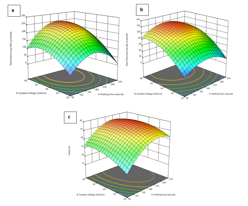 The decrease of the response occurred directly proportionally in this study. The variation in extraction yield as a function of holding time and gradient voltage is presented in Figure 3. The results demonstrated that the yield increased significantly with both longer holding times and higher gradient voltage applications. At elevated gradient voltage levels, the permeability of ant nest cellular structures likely increased due to the enhanced energy input, facilitating the release of phenolic and flavonoid compounds. This improved mass transfer efficiency resulted in higher extraction yields. Additionally, the influence of holding time was more pronounced at lower gradient voltages, where extended processing allowed for a more complete diffusion of bioactive components. However, at higher gradient voltages and prolonged holding times, the yield tended to reach an equilibrium point, indicating that further extension of the extraction time did not substantially enhance the yield.