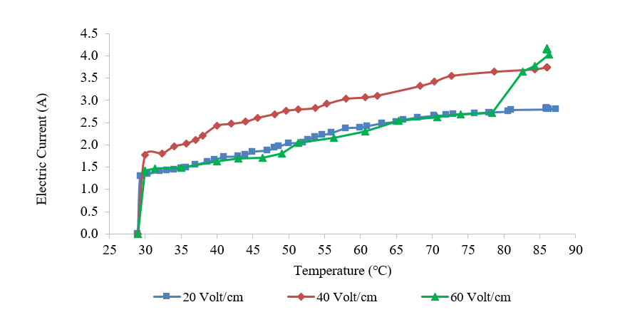 Figure 3 illustrates the relationship between temperature and electric current under varying voltage gradients during the ohmic extraction of ant nest. At a voltage gradient of 20 V/cm, the electric current increased gradually from 1.5 A at 30 °C to approximately 2.8 A at 88 °C. Higher voltage gradients (40 and 60 V/cm) resulted in a steeper increase in current, with the most pronounced jump observed at 60 V/cm. This sudden rise in current at temperatures above 80 °C indicates a significant reduction in material resistance and enhanced electro-osmosis, leading to more efficient heating. This study monitored temperature using a single central sensor. However, uniform temperature distribution across the sample was not empirically validated through multi-point thermal mapping. Future studies should incorporate thermocouples at various radial and axial positions to confirm the spatial uniformity of ohmic heating and ensure consistent processing outcomes.