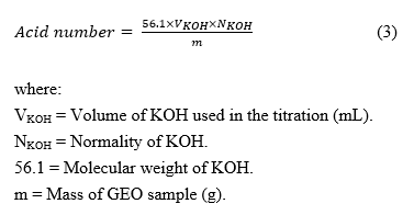 GEO (2 g) was accurately weighed and placed in a 250 mL conical flask. Freshly neutralized hot ethanol (8 mL) and phenolphthalein indicator solution (5 drops) were added. The mixture was heated to boiling for approximately 5 min and then titrated while still hot with 0.2 N KOH in ethanol. The solution was vigorously shaken during titration. The acid number was calculated using the following formula [44]: