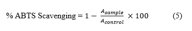 The ABTS stock solution (7.0 mM) was mixed with an equal volume of potassium persulfate (K₂S₂O₈) solution (2.45 mM) and incubated in the dark at room temperature for 14 h. The resulting ABTS solution was diluted with ethanol to achieve an absorbance of 0.70 ± 0.02 at 734 nm. In a 96-well microplate, 130 µL of diluted ABTS solution was added to 20 µL of each GEO sample (at concentrations of 1, 5, 10, 20, 50, and 100 µg/mL in ethanol) or Trolox (positive control) in ethanol (Duan et al.). After incubation in the dark for 6 min, absorbance was measured at 734 nm using ethanol as the blank. The IC₅₀ value (the concentration required to scavenge 50% of ABTS radicals) was determined from a graph plotting the percentage inhibition against the GEO concentration. The ABTS radical scavenging activity was calculated using the following formula: