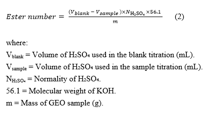 GEO (2 g) was accurately weighed and placed in a 125 mL separatory funnel. Ethanol (8 mL) was added, followed by a few drops of the phenolphthalein indicator. The mixture was neutralized by the addition of NaOH solution until a pink color appeared. Zero point five N KOH in ethanol (25 mL) was added and the mixture was shaken until the pink color disappeared. The solution was refluxed for 1 h. After cooling, the excess base was titrated with 0.25 N sulfuric acid (H₂SO₄) until the pink color reappeared. Blank titration was performed using the same procedure but without the GEO sample. The ester number was calculated using the following formula [44]: