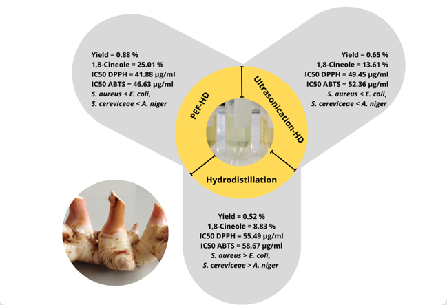 Keywords: Galangal essential oil, Pulsed electric field, Ultrasonication, Hydrodistillation, Antimicrobial, Antioxidant