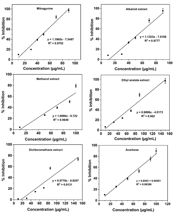 In vitro α-glucosidase inhibitory assays revealed that mitragynine exerted the strongest inhibitory activity (IC₅₀ = 48.09 µg/mL), surpassing both the crude extracts and the reference drug acarbose on a weight basis. Molecular docking studies supported these results, showing favorable binding affinities of mitragynine and other kratom alkaloids with the α-glucosidase active site.