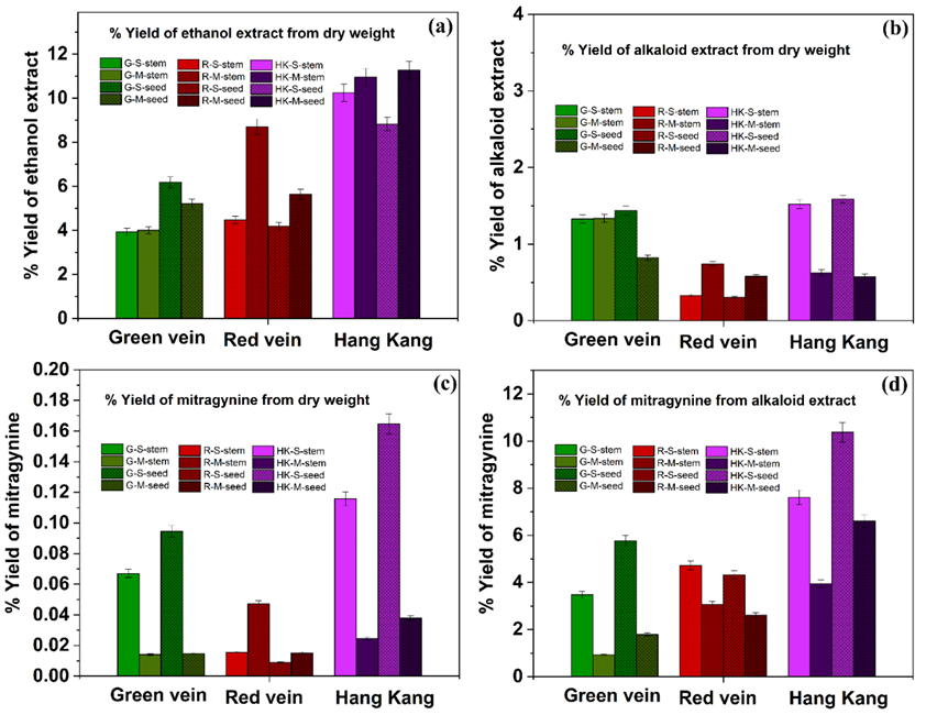 Therefore, this study aims to (1) compare total alkaloid and mitragynine content in 3 kratom varieties - green vein, red vein, and the indigenous “Hang Kang” cultivar - propagated by seed and stem cutting, and harvested at 2 leaf maturity stages (semi-mature and mature), and (2) evaluate the α-glucosidase inhibitory activity of mitragynine and other alkaloids through in vitro assays and molecular docking. Extraction, purification, and HPLC quantification of mitragynine were performed alongside in vitro enzyme inhibition assays and docking simulations to assess binding affinity and interaction mechanisms. The novelty of this work lies in integrating alkaloid quantification with in vitro and in silico enzyme inhibition studies to identify optimal cultivation strategies for future pharmacological applications.