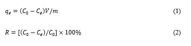 A 10 ppm MB solution was treated with WCGs-AC adsorbents listed in Table 1, each applied at 1 g/L. The WCGs-AC was stirred in the MB solution at 500 rpm for 10 to 60 min at room temperature. At 10-min intervals, the absorbance of the aliquots was recorded at 664 nm using a UV-Vis spectrophotometer. The adsorption capacity (qe) and MB removal efficiency (R) of the WCGs-AC were calculated using Eqs. (1) and (2).
