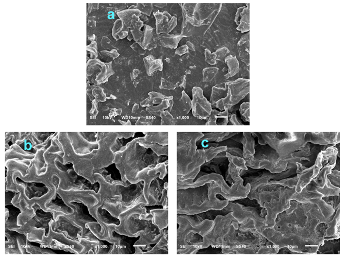 In commercial applications of physical activation, the 2nd step involves activation in an oxidizing gas atmosphere, such as steam, carbon dioxide, nitrogen, or a mixture with air, at elevated temperatures ranging from 400 to 900 °C. The 1st step is carbonization (pyrolysis) conducted in an inert atmosphere. Although physical activation is a relatively costly technique for producing activated carbon, it can yield porous carbon structures with strong physical stability. However, this method has several drawbacks, including limited adsorption capacity, high energy consumption, and extended activation times [33]. To address the challenge of excessive energy consumption, activated carbon in this study was synthesized through gas-free carbonization in a relatively short duration, only 10 min. The absence of a gas flow during pore formation was compensated for by pre-washing the spent coffee grounds with hexane and hot water before activation. This washing step helps remove coffee oils [62] and other impurities [63,64].