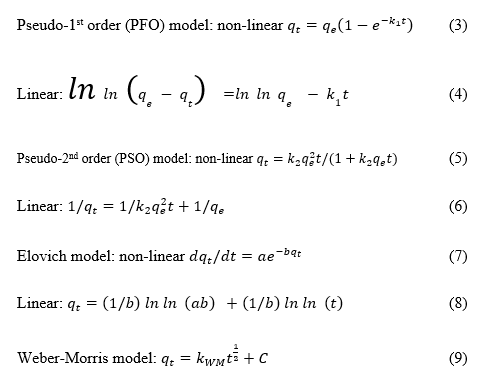 The pseudo-1st-order, pseudo-2nd-order, Elovich, and Weber-Morris models fit the time series experimental data [73]. The models are described in Eqs. (3) - (9).