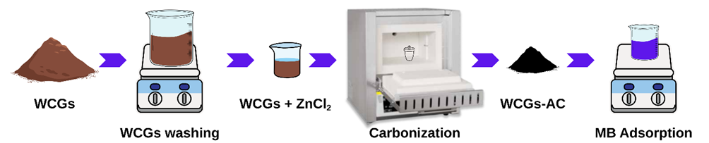 In a previous study, waste coffee grounds (WCGs) washed with hexane were directly employed for the removal of Methylene Blue (MB), achieving a maximum adsorption capacity of 416.67 mg/g [72]. Both raw WCGs and their activated form (WCGs-AC) exhibited similar functional groups, including amine (N–H), hydroxyl (–OH), and carbonyl (C–O), which contributed to dye adsorption. However, aspects such as the influence of different washing methods and carbonization temperatures, pore characteristics, post-adsorption properties of WCGs-AC, and adsorption kinetics were not previously investigated. In the present study, 2 washing methods were applied to WCGs - using hexane and hot water - before chemical activation with ZnCl2 and subsequent carbonization under oxygen-limited conditions to enhance their physicochemical properties. The novelty of this work lies in the improved synthesis approach and the comprehensive evaluation of pore structure (via BET analysis), functional group transformations before and after MB adsorption (via FTIR), and adsorption kinetics. The resulting WCGs-AC exhibited a high specific surface area, fast adsorption rate, and excellent reusability. The abundant surface area and active binding sites facilitate MB adsorption through diffusion and chemisorption mechanisms, enabling environmentally sustainable regeneration.