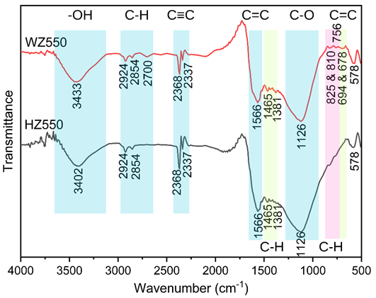A total of 20 g of the cleaned WCGs were soaked in a solution containing 9 g of ZnCl2 in 60 mL of water for 24 h. The WCGs were then dried at 100 °C for 5 h. The activated WCGs were subsequently carbonized at 450, 500 and 550 °C for 10 min in a furnace (heating rate: 5 °C/min), cooled to room temperature in air, and neutralized with 50 mL of 5% HCl for 2 h. They were then rinsed with distilled water several times until the pH of the rinsing water was neutral. The WCGs-AC were sieved using a 200-mesh sieve to achieve uniform particle size. Then WCGs-AC was stored in a desiccator before characterization and adsorption experiments. The resulting WCGs-AC samples were named according to their washing methods and carbonization temperatures, as shown in Table 1.