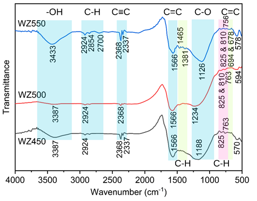 ZnCl2 pretreatment promotes the formation of mesopores and micropores. It acts as a dehydrating agent, facilitating the removal of moisture and volatile compounds from the biomass precursor. Additionally, ZnCl2 catalyzes cellulose, hemicellulose, and lignin thermal degradation. Increasing the carbonization temperature leads to more mesopores and micropores [39]. ZnCl2 enhances the specific surface area, pore volume, and methylene blue (MB) adsorption capacity of activated carbon derived from shaddock peel. ZnCl2-activated carbon made from citrus peel has demonstrated high MB adsorption performance. The ZnCl2 treatment increased porosity by more than 4.54% and improved MB adsorption capacity up to 336 mg/g [61].