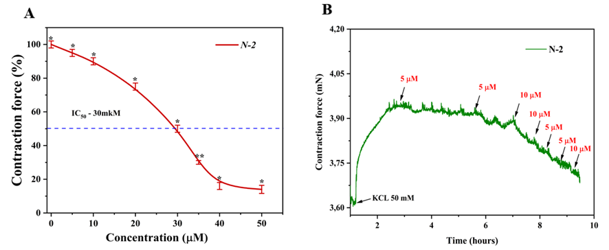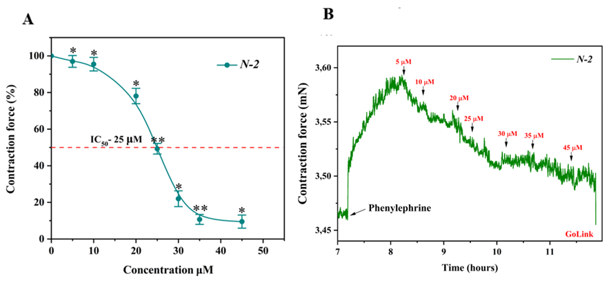 The strong inhibition of KCl-induced contraction implies a primary effect on L-type calcium channels. This was further supported by the additive effect observed when N-2 was combined with verapamil, a standard L-type blocker, suggesting either cooperative binding or a complementary mechanism of action. Likewise, the suppression of phenylephrine-induced contraction - further enhanced by phentolamine - confirms N-2’s multi-targeted inhibition of both calcium entry via α1-adrenergic signaling and internal calcium release.