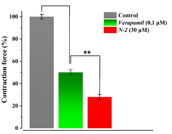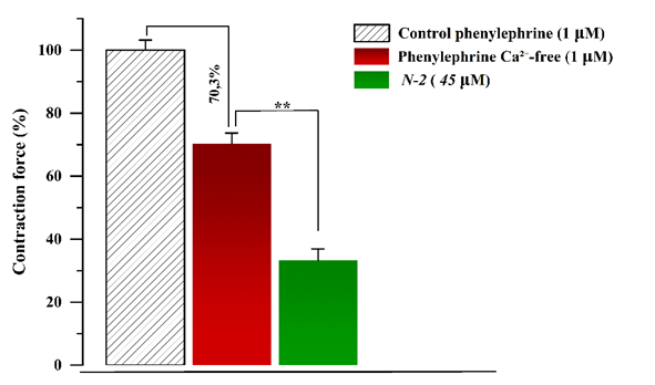 These findings suggest that without extracellular Ca2+, N-2 polyphenol significantly reduces the force of contraction caused by phenylephrine (1 μM). This suggests that these kinds of compounds can reduce Ca2+ ion release from the SR and consequently influence the intracellular Ca2+ concentration ([Ca2+]in).