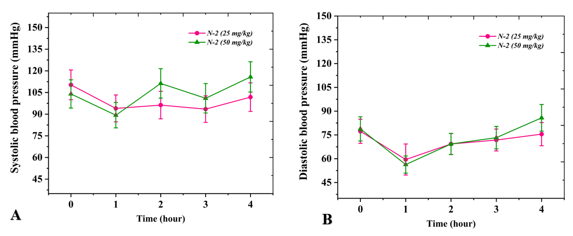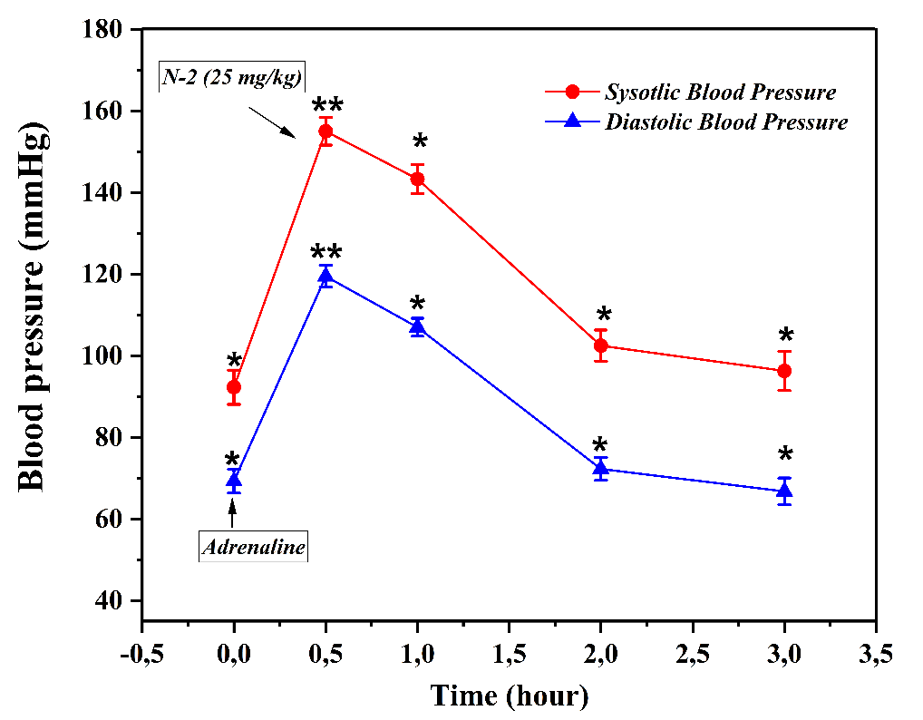 In vivo studies were conducted in 2 phases. In the first phase, the hypotensive effect of the N-1 polyphenol and its time-dependent changes in the organism were evaluated. For this purpose, N-2 polyphenol was administered to rats at doses of 25 and 50 mg/kg, and blood pressure was measured hourly over a 4-hour period [29]. Before the experiment, the baseline systolic blood pressure of the rats was 110.3 ± 3.5 mmHg, and the diastolic pressure was 77.8 ± 2.7 mmHg. Following the administration of N-2 polyphenol, a significant decrease in both systolic and diastolic blood pressure was observed (Table 1).