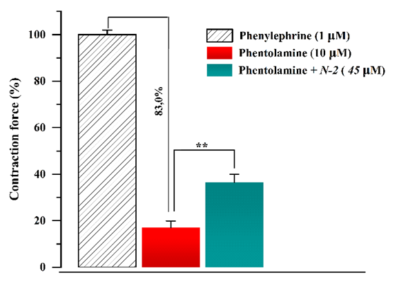 The results show that blocking receptor-operated Ca2+ channels may explain the relaxant action of the tested polyphenol. The effects of the polyphenol and the α-adrenoceptor blocker phentolamine were evaluated [18] in order to investigate this process more. In the absence of phentolamine, N-2 polyphenol (45 μM) lowered the contraction caused by 1 μM phenylephrine as seen in prior investigations. The contraction generated by 1 μM phenylephrine fell by 83.4 ± 2.7% when 10 μM phentolamine was introduced, compared to the control. Under these circumstances, N-2 polyphenol decreased the contraction by 63.5 ± 3.4% as compared to the control (Figure 8).