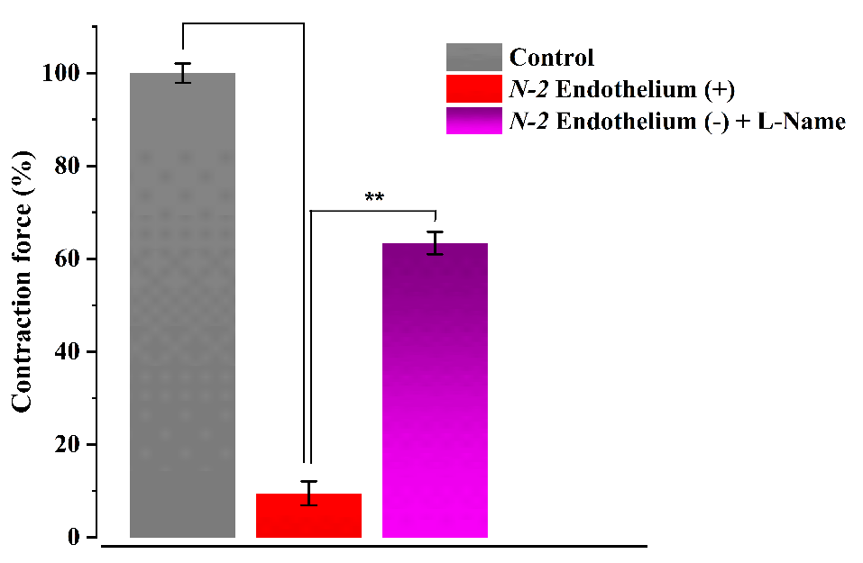 In functional endothelium preparations, different concentrations of N-2 polyphenol caused relaxation of the vessels, inhibiting phenylephrine-evoked contraction by a mean value of 90.5 ± 3.5% versus control (Figure 10). In preparations where the endothelium was mechanically stripped, relaxation activity was greatly inhibited with a mean inhibition of only 38.0 ± 3.1%. All these observations indicate that the vasorelaxant effect of N-2 polyphenol is primarily endothelium-dependent. The surprising decrease in activity of the compound after endothelium removal once again underlines the pivotal position of endothelium in mediating N-2 polyphenol’s vasodilatory effects.
