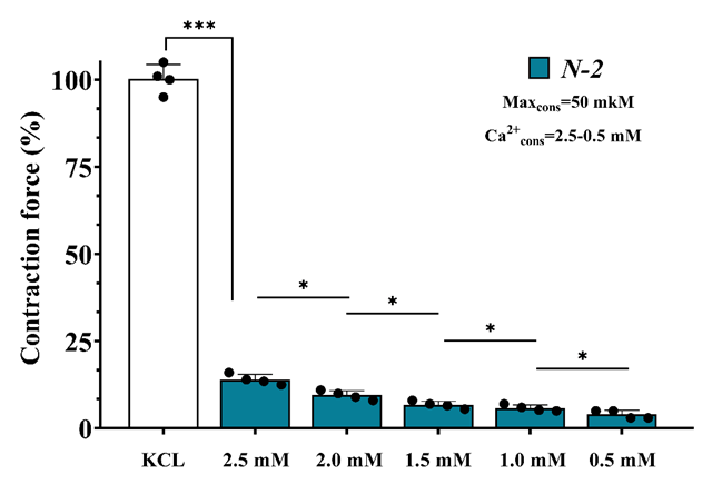Figure 5 Effect of N-2 polyphenol on the relaxing activity depending on the [Ca2+] concentration in the medium. The vertical axis (ordinate) shows the contraction force of the aortic preparation induced by KCl (50 mM), which is considered as 100%. The horizontal axis (abscissa) represents the Ca2+ concentration (0 - 2.5 mM). In all cases, p < 0.05; n = 3 - 4.