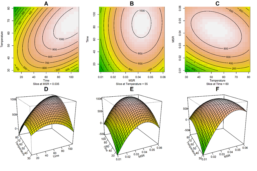 The interactive effects of extraction parameters on the total flavonoid content (TFC) of NADES-based extracts from Erythrina crista-galli twigs were evaluated through two-dimensional contour plots and three-dimensional response surface plots, as illustrated in Figure 2. These visualizations highlight the influence of pairwise interactions among the three independent variables, while the third variable is held constant. The contour plots in Figures 2(A) - 2(C) reveal significant synergistic and antagonistic effects between the variables, aiding in the rapid identification of optimal extraction conditions. Color gradients represent TFC levels, where lighter shades correspond to higher flavonoid concentrations, while green to yellow areas indicate reduced TFC.