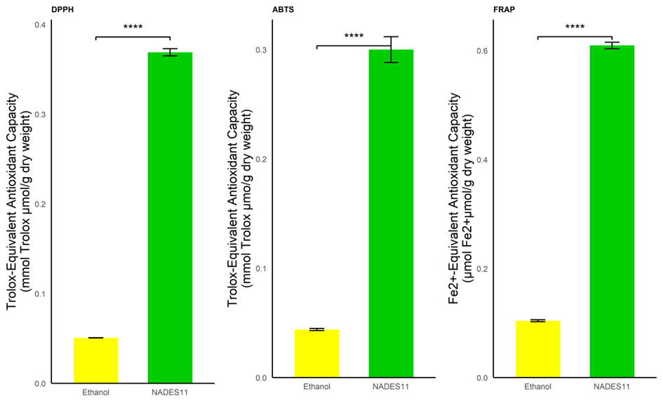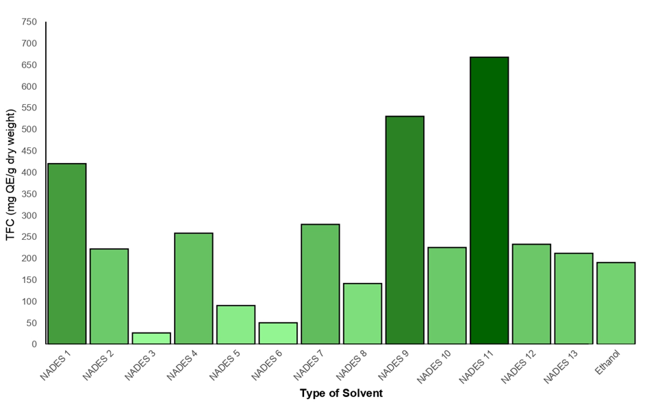 In this study, antioxidant activity was assessed using three complementary assays: DPPH, ABTS, and FRAP. The extract obtained with the NADES-11 formulation showed significantly higher antioxidant capacity than the ethanol extract (p < 0.0001), with measured values of 0.3690 ± 0.0039 mmol TE/g (DPPH), 0.2965 ± 0.0118 mmol TE/g (ABTS), and 0.6095 ± 0.0059 mmol Fe²⁺/g dry weight (FRAP). When compared to NADES-based extractions from other plant species, these results suggest, relatively good antioxidant capacity. For instance, Pluchea indica extracted using choline chloride: urea reported a DPPH value of 123.861 μmol QE/g dry weight [28]. Although these studies employed different antioxidant standards and units, the activity observed here appears comparatively higher when expressed in Trolox equivalents. Additionally, the DPPH value obtained in this study falls within or slightly above the range of 0.282 -0.447 mmol TE/g reported for lignin fractions extracted from bamboo [44], indicating antioxidant capacity considered good in similar natural matrices despite differences in composition. The ABTS and FRAP values observed (0.2965 ± 0.0118 mmol TE/g and 0.6095 ± 0.0059 mmol Fe²⁺/g dry weight, respectively) also exceed other reported values for comparable NADES-based plant extractions, such as 261.237 μmol TE/g and 198.147 μmol TE/g dry weight, suggesting relatively good radical-scavenging and reducing capacity. Furthermore, compared to the study by Hu et al. (2023), which reported DPPH, FRAP, and ABTS values of 0.1555 ± 0.0098, 0.1132 ± 0.0049, and 0.0894 ± 0.0027 mmol Trolox/g dry weight, respectively and interpreted those results as demonstrating good antioxidant potential—the present values are clearly higher within the same unit system. Overall, this relatively good antioxidant capacity aligns with the high total flavonoid content obtained under optimized extraction conditions, supporting the role of flavonoids as important contributors to the observed radical-scavenging and reducing activities. These findings collectively highlight the enhanced efficiency of NADES-11 not only in extracting a higher yield of antioxidant compounds, such as flavonoids and phenolics, but also in preserving their functional stability during extraction. The superior performance of NADES-11 is likely attributed to its polarity, hydrogen-bonding capacity, and the affinity of polyphenolic compounds for the eutectic solvent matrix, which together support the effective recovery of bioactive constituents.