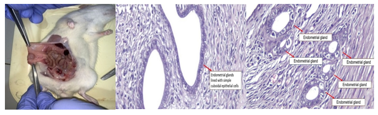 Based on observations in Figure 1, the laparotomy procedure was carefully performed to ensure successful transplantation of endometrial tissue. The procedure was carried out without any mortality among the experimental rats, indicating that it was safe and well-controlled. Histological analysis revealed the presence of endometrial glands within the peritoneal tissue of the rats, confirming the implantation and growth of endometrial tissue at the peritoneal site. These findings suggest that the rat model used in this study effectively replicates key features of human endometriosis.
