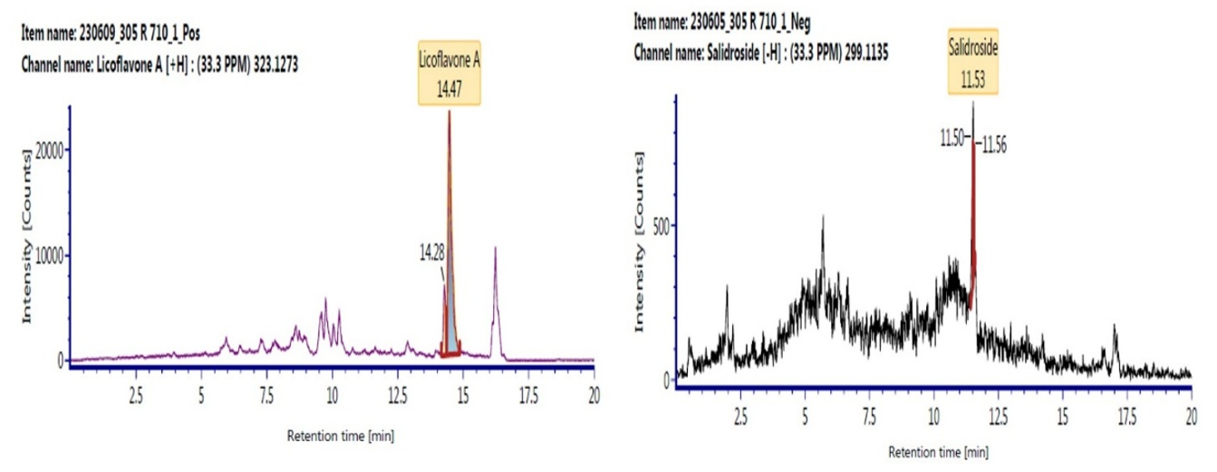 The analysis revealed that MBPE contains 9 flavonoid derivatives and 7 phenolic derivatives, both of which are known to play significant roles in inhibiting oxidative stress and inflammation. Among the identified flavonoids, licoflavone A and kaempferol were detected as major compounds, both recognized for their potent anti-inflammatory and antioxidant properties that are particularly relevant in managing endometrial inflammation and oxidative damage. Notable phenolic compounds included salidroside and coniferol, which have been extensively studied for their antiproliferative and anti-inflammatory effects against abnormal tissue growth. Among the identified compounds, licoflavone A showed the highest intensity, indicating it as the most abundant flavonoid in MBPE, followed by kaempferol and salidroside as the predominant phenolic compound. The presence of these bioactive compounds strengthens the scientific basis for utilizing MBPE as a potential therapeutic agent for the management of endometriosis. The details of the identified compounds are presented in Table 1.